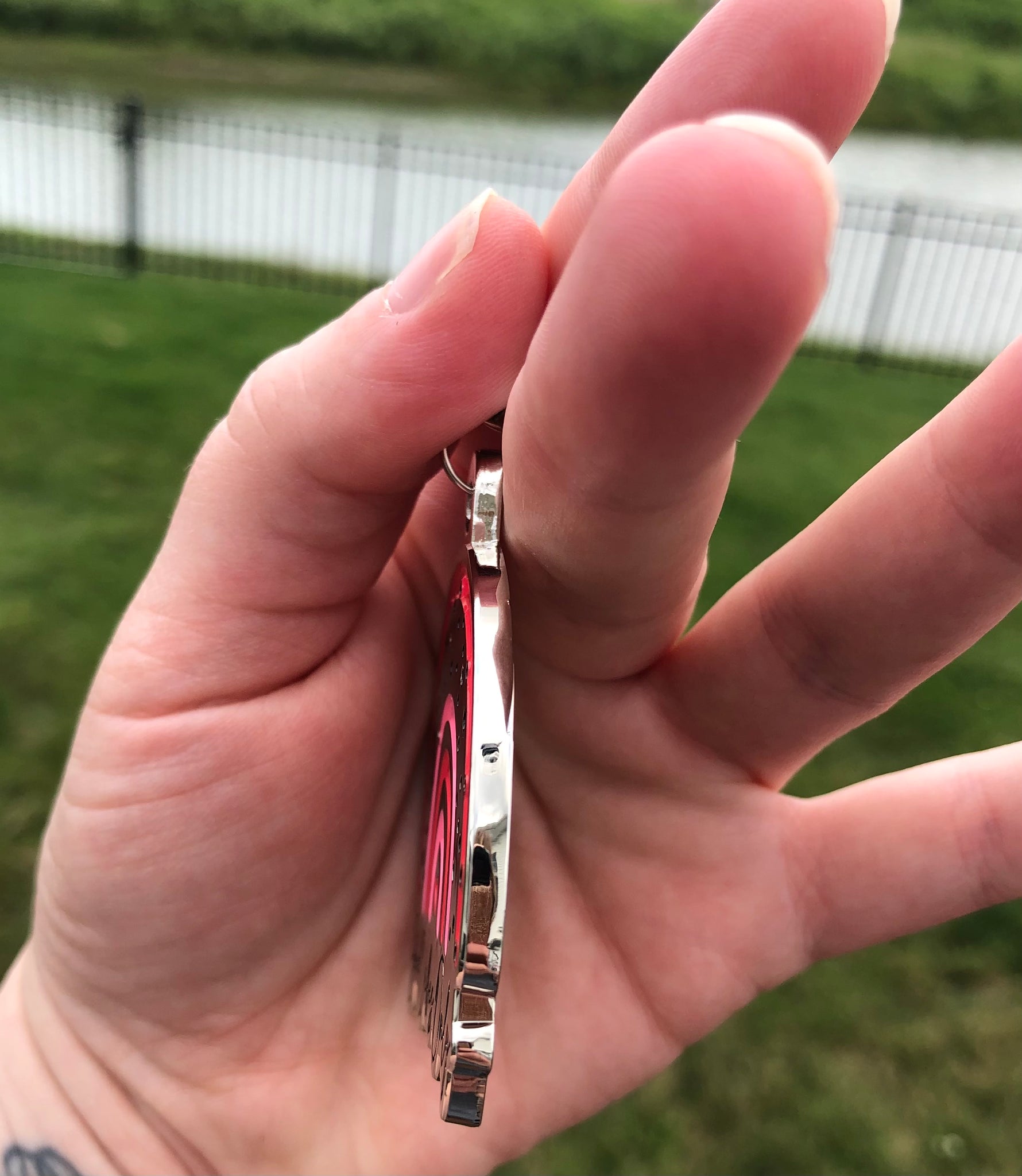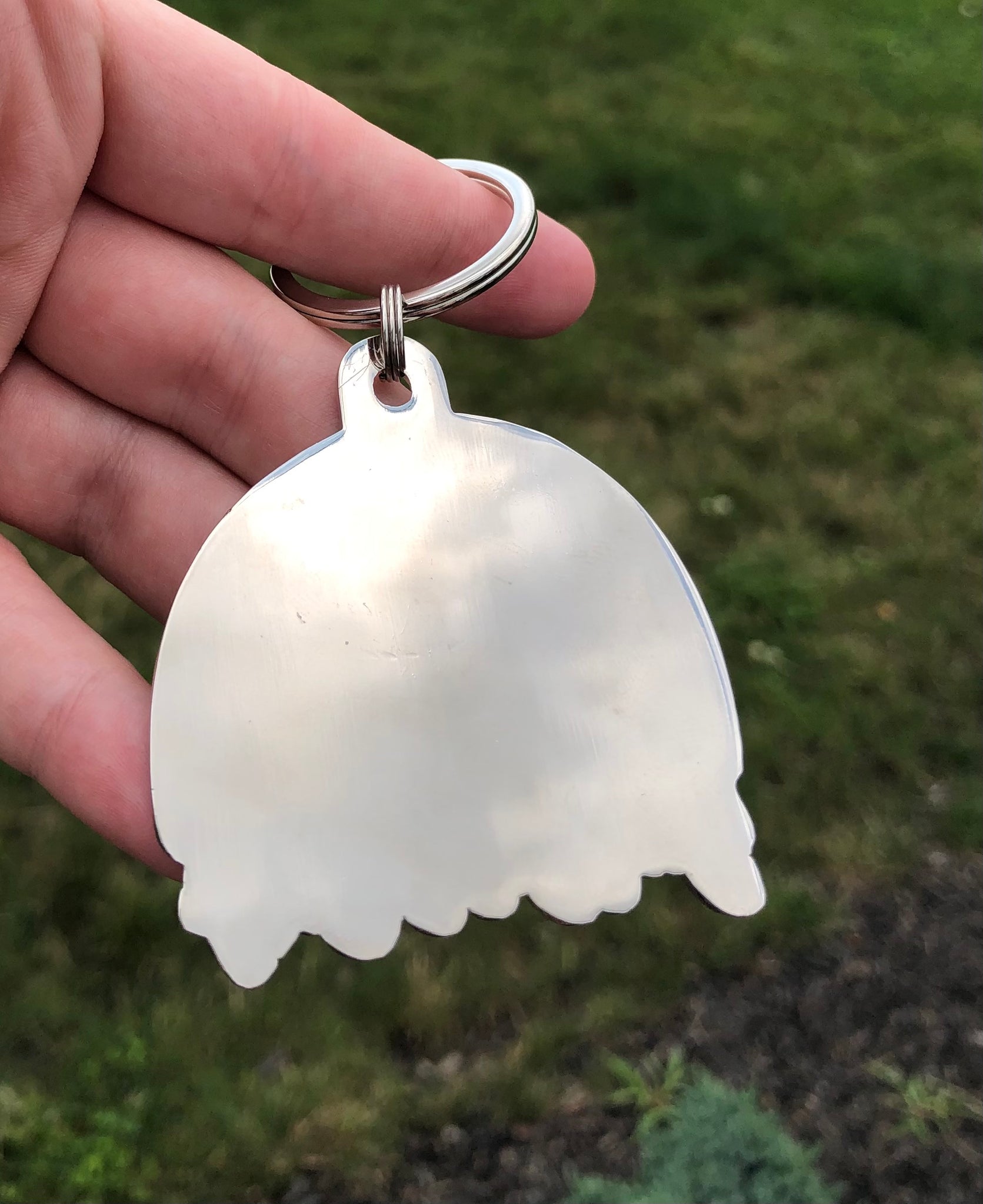 dimensions: roughly 2”x2” (pendant) with keychain 3”x2”