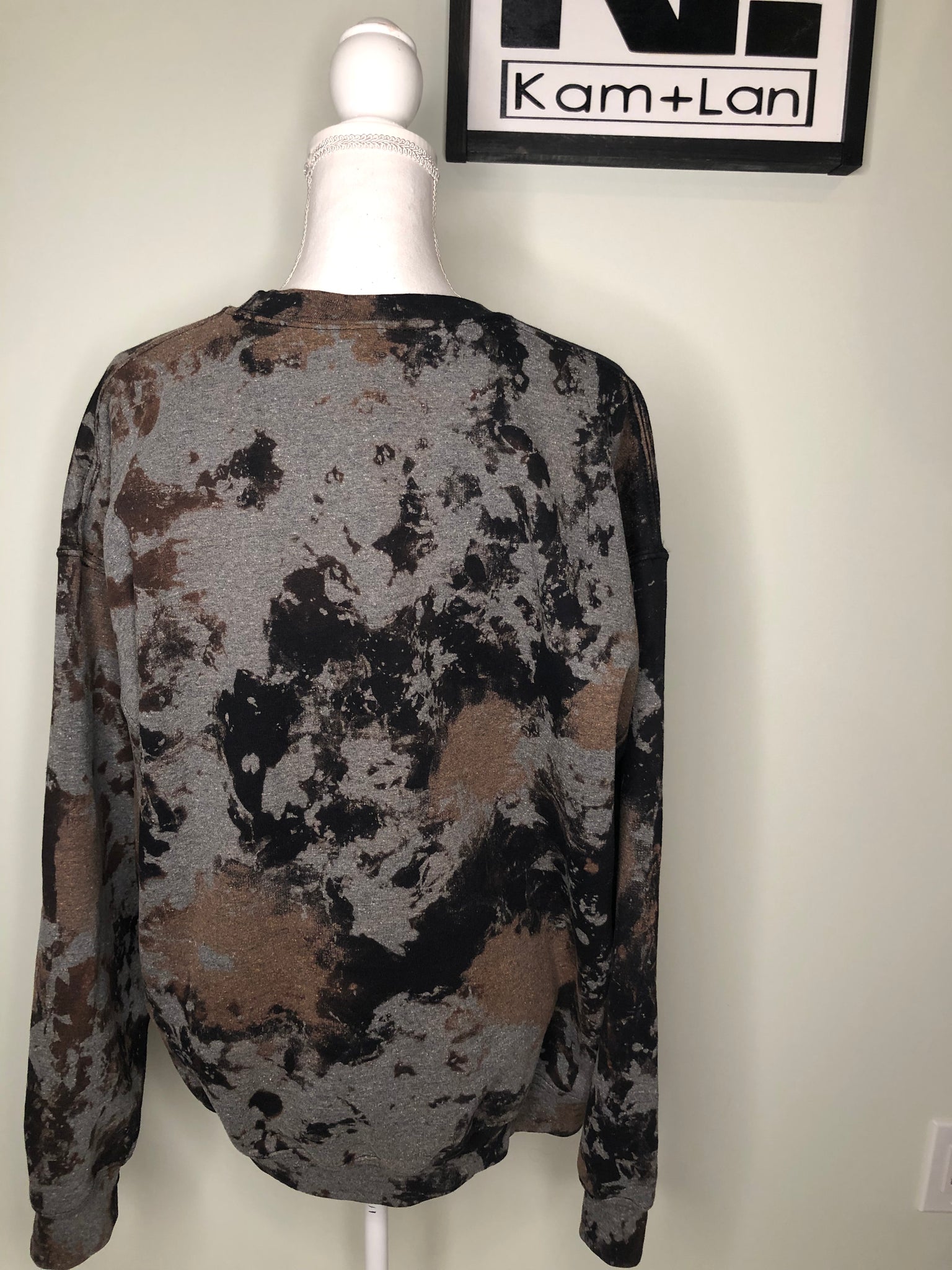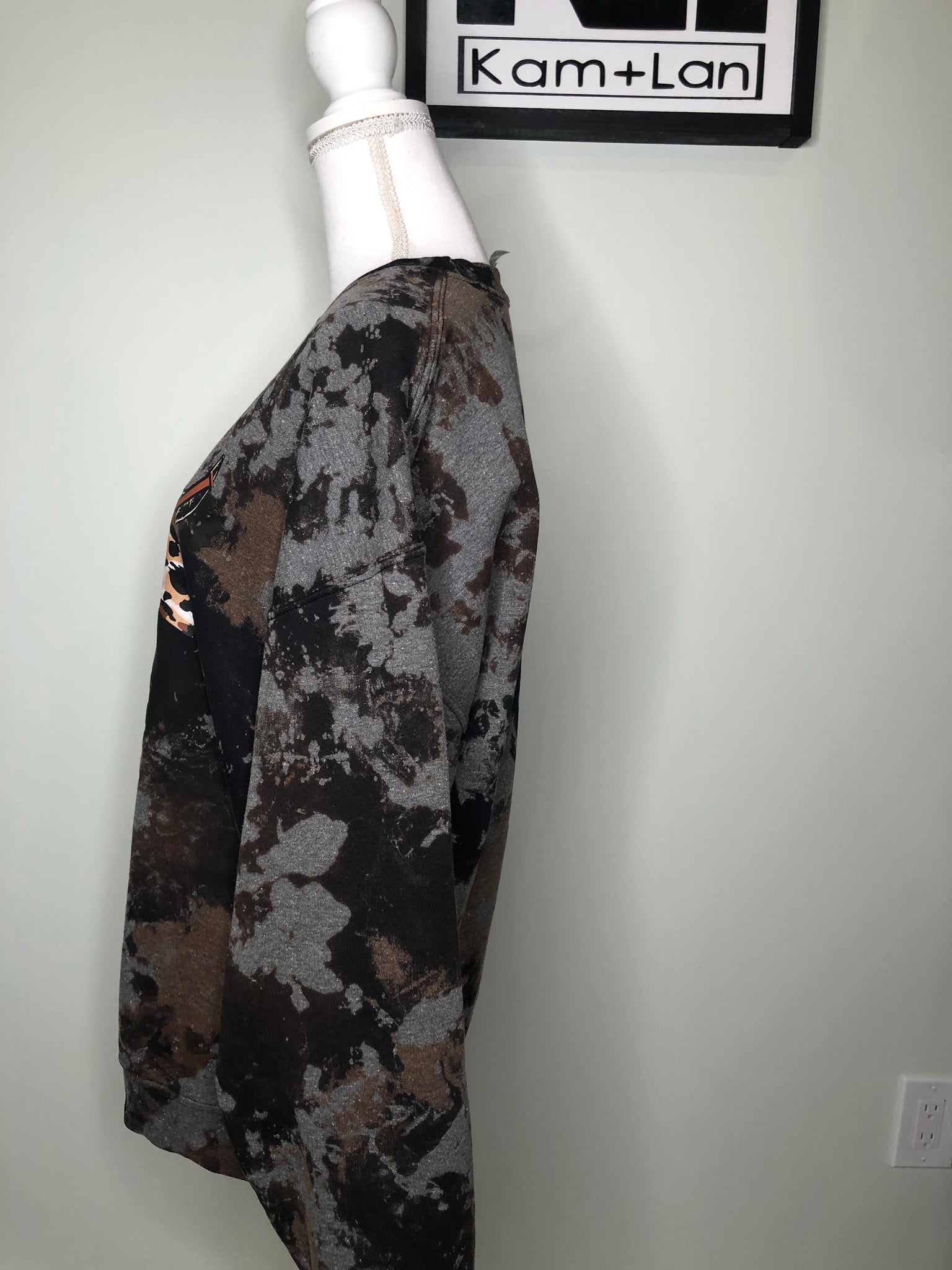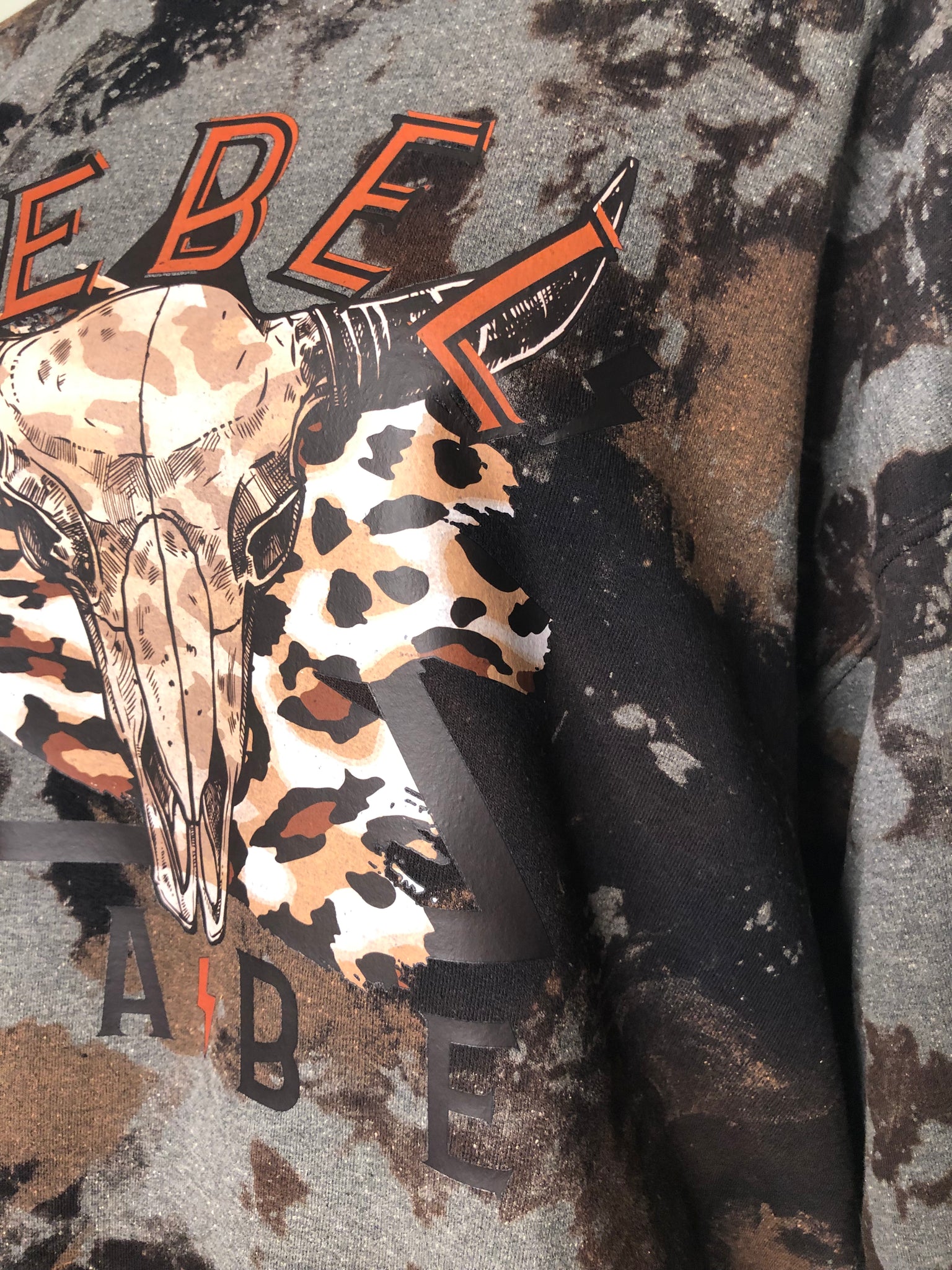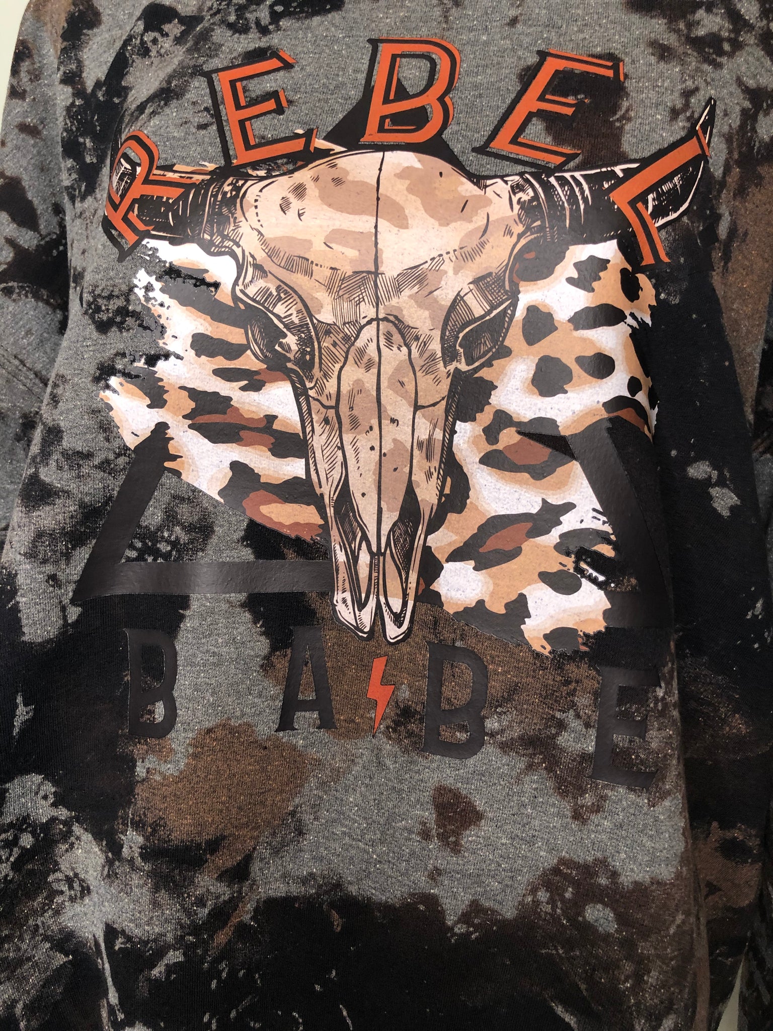 Rebel Babe skull unisex black/grey/browns crewneck. Each is hand bleached and color variations can vary from sweatshirt to sweatshirt making each one unique! This sweatshirt takes multiple steps/hours to make and create!!